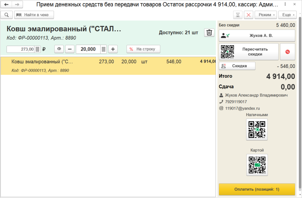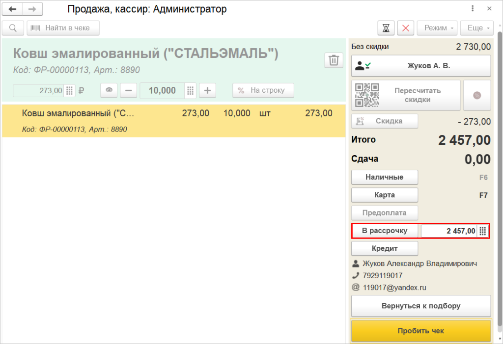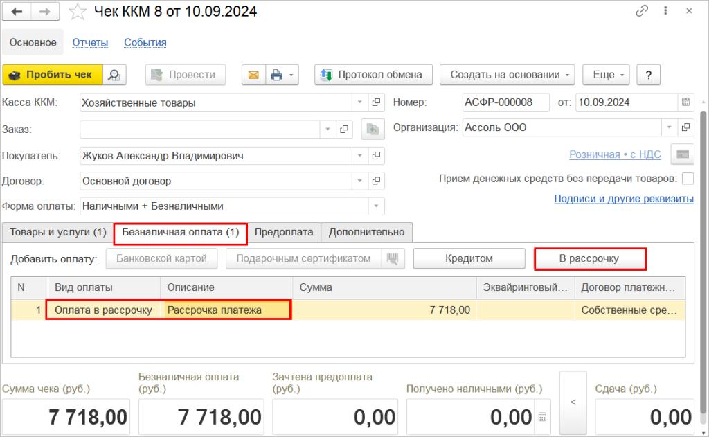 В новом документе «Чек ККМ» выберите покупателя и добавьте товар. Когда документ проведется, на вкладке «Безналичная оплата» нажмите кнопку «В рассрочку». В таблицу оплат добавится строка с видом оплаты «Оплата в рассрочку» и описанием «Рассрочка платежа» (рисунок 2). При частичной оплате в таблицу можно добавить другой вид оплаты на определенную сумму. Пробейте чек.