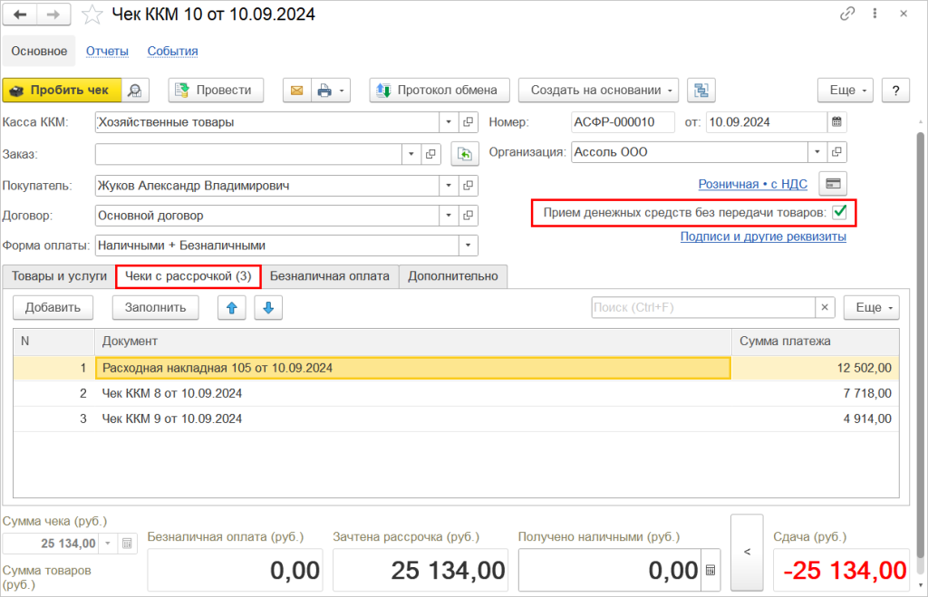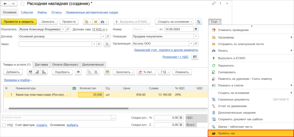 После добавления товаров и выбора покупателя проведите документ. Пробейте чек, выбрав одноименную команду по кнопке «Еще» (рисунок 4).