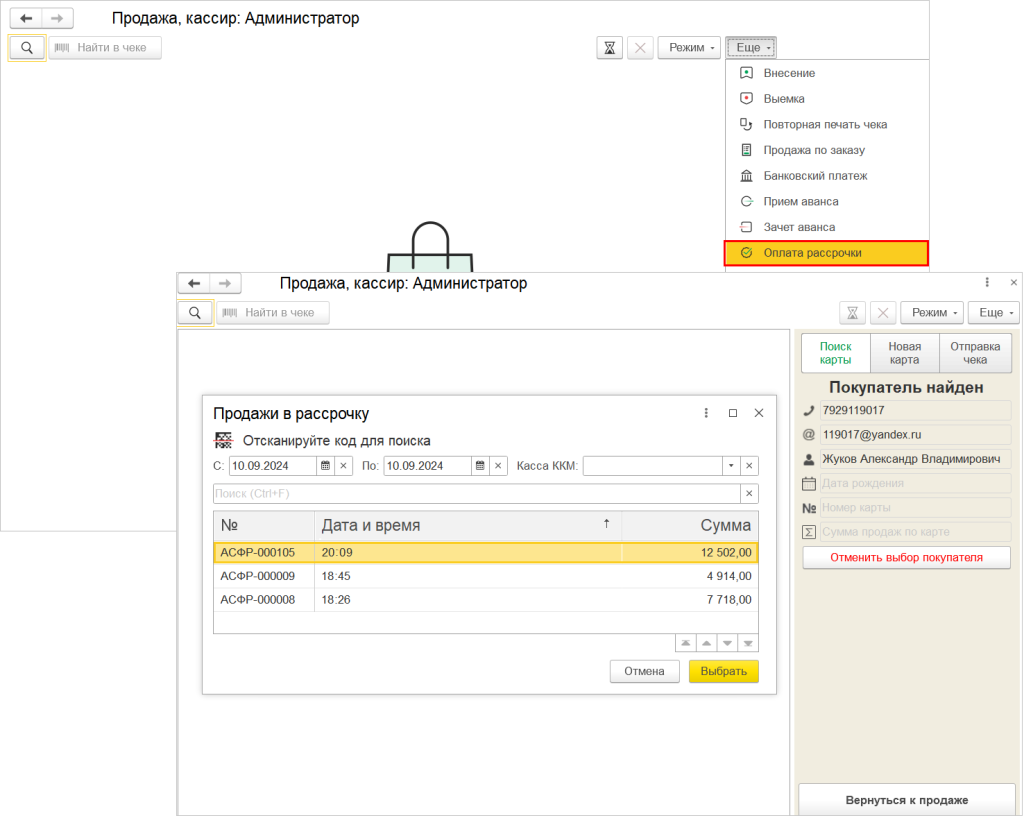 В меню «Еще» выберите команду «Оплатить рассрочку». После выбора покупателя из открывшегося списка выберите документ отгрузки в рассрочку для оплаты (рисунок 6).