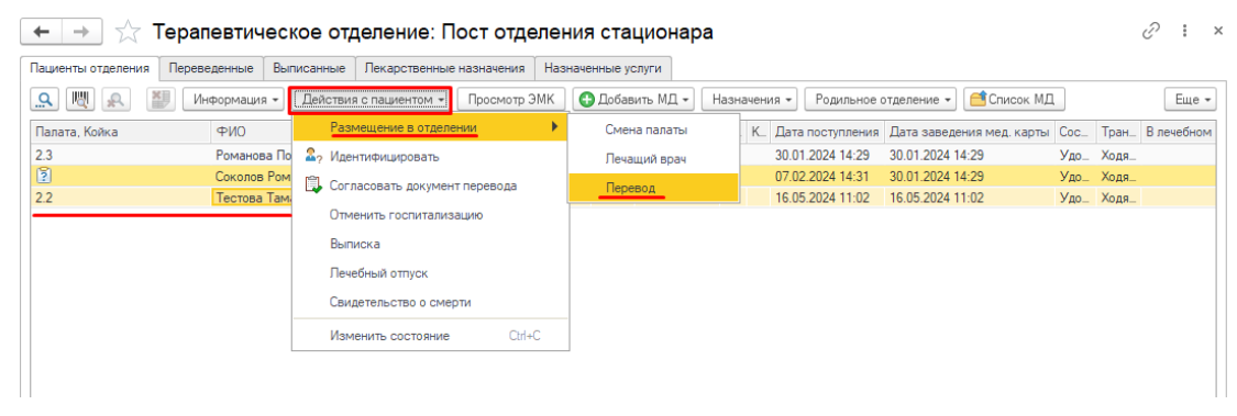 Для перевода пациента откройте форму «Размещение в отделении» и выберите пункт «Перевод» (рис.10).