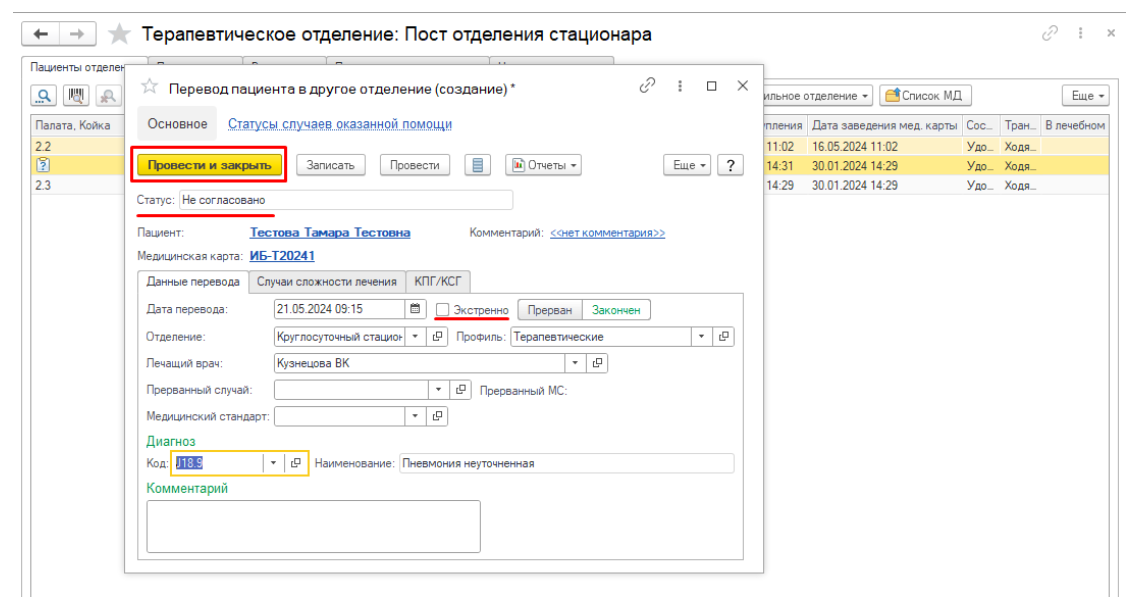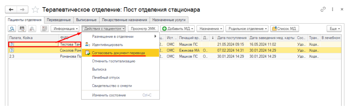 После этого пациент остается в списке текущего отделения до момента согласования. Как только документ получает статус «Согласовано», пациент будет отображаться в списке нового отделения (рис.13).