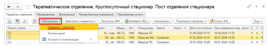 Чтобы просмотреть сведения о пациенте, выберите его из списка отделения и нажмите «Информация» – «Сведения о пациенте» (рис.16).