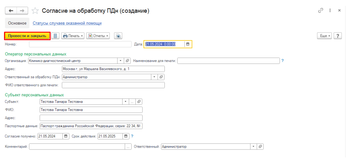 После подтверждения нужно заполнить форму согласия, нажмите "Провести и закрыть" (рис.18).