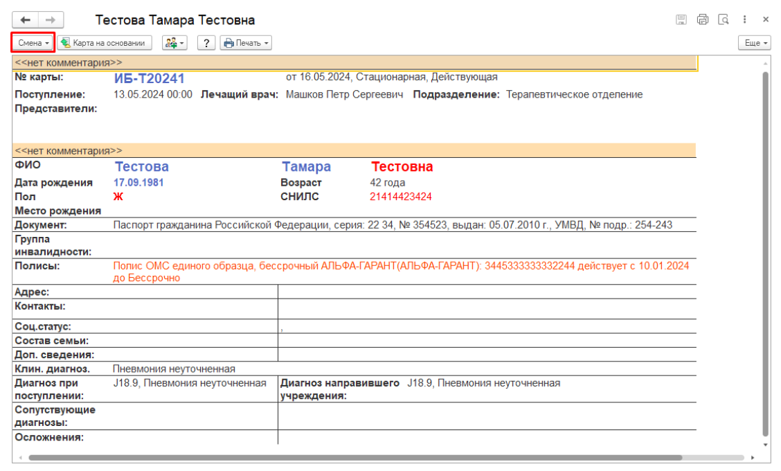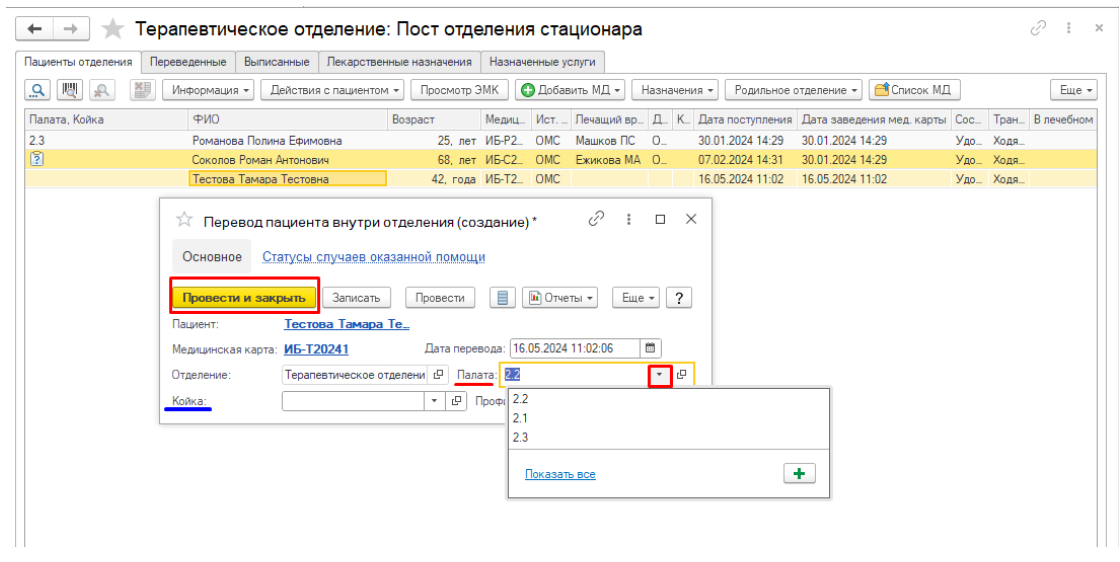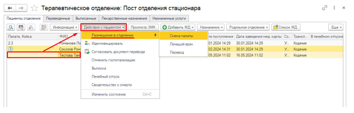 Нажмите «Смена палаты», затем укажите нужную палату и, при необходимости, номер койки.