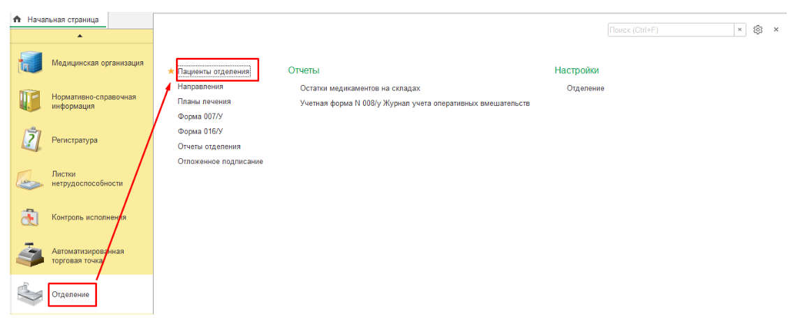 Для начала работы с пациентом следует открыть раздел «Пациенты отделений» (рис.2).