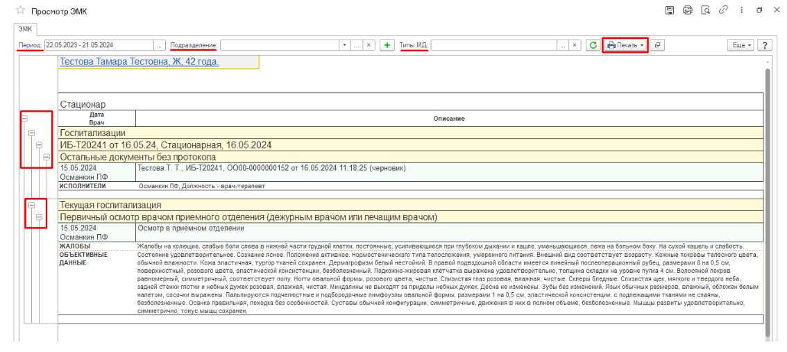 Раздел «Просмотр ЭМК» позволяет получить выписки из меддокументов пациента за указанный период. Информация отображается в виде таблицы и содержит: