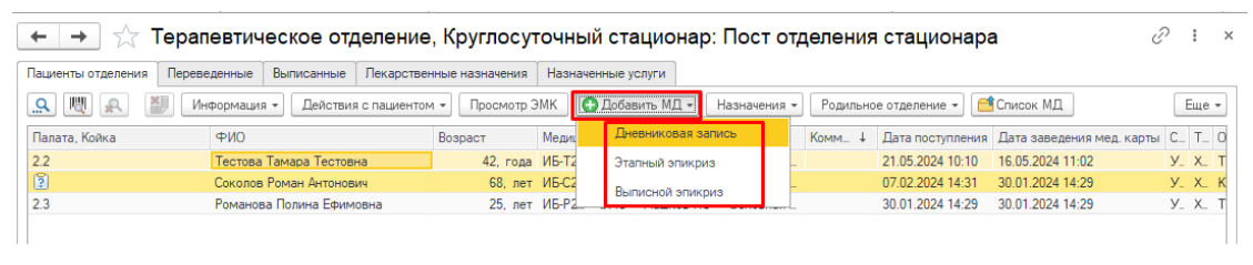 Чтобы создать медицинские документы (дневниковые записи, эпикризы и т.д.), используйте кнопку «Добавить МД» (рис.22)..png)