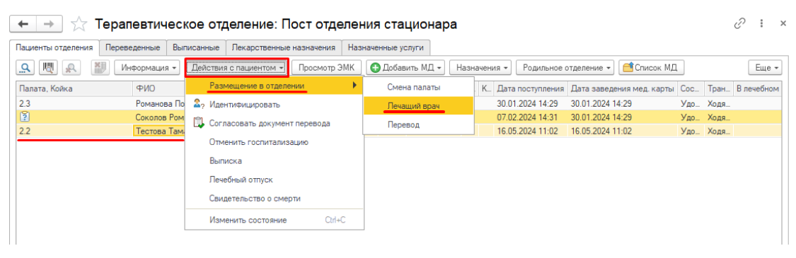 Если у пациента не назначен лечащий врач или не указана палата, в форме «Пост отделения стационара» следует выбрать его в списке, нажать кнопку «Действия с пациентом» и выбрать «Размещение в отделении».
