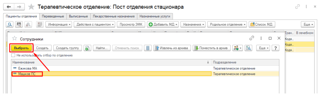 В появившемся окне будет отображаться список всех пациентов, находящихся на лечении в текущем отделении.